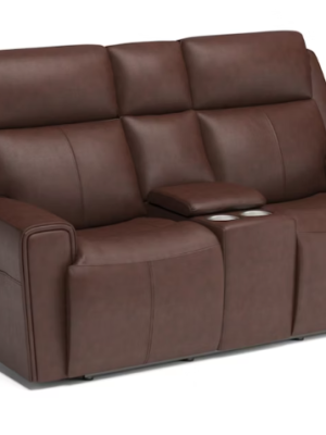 Flexsteel Barnett Power Reclining Loveseat with Console, Power Headrests and Lumbar, “Timber Brown Leather”