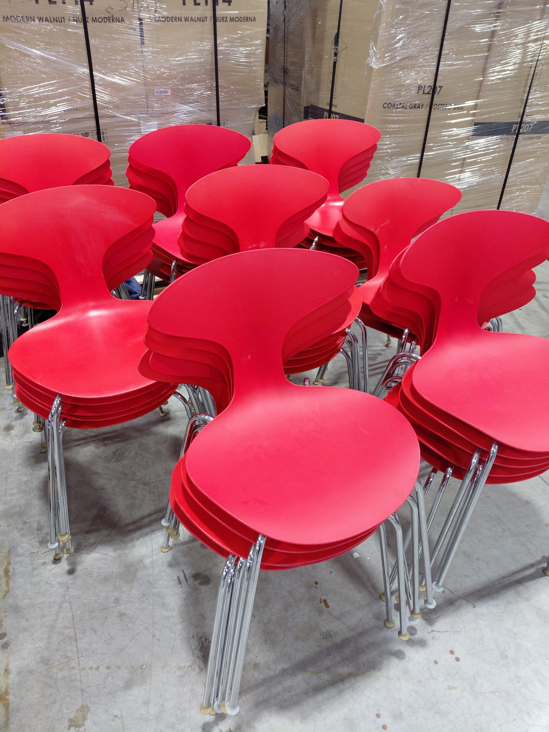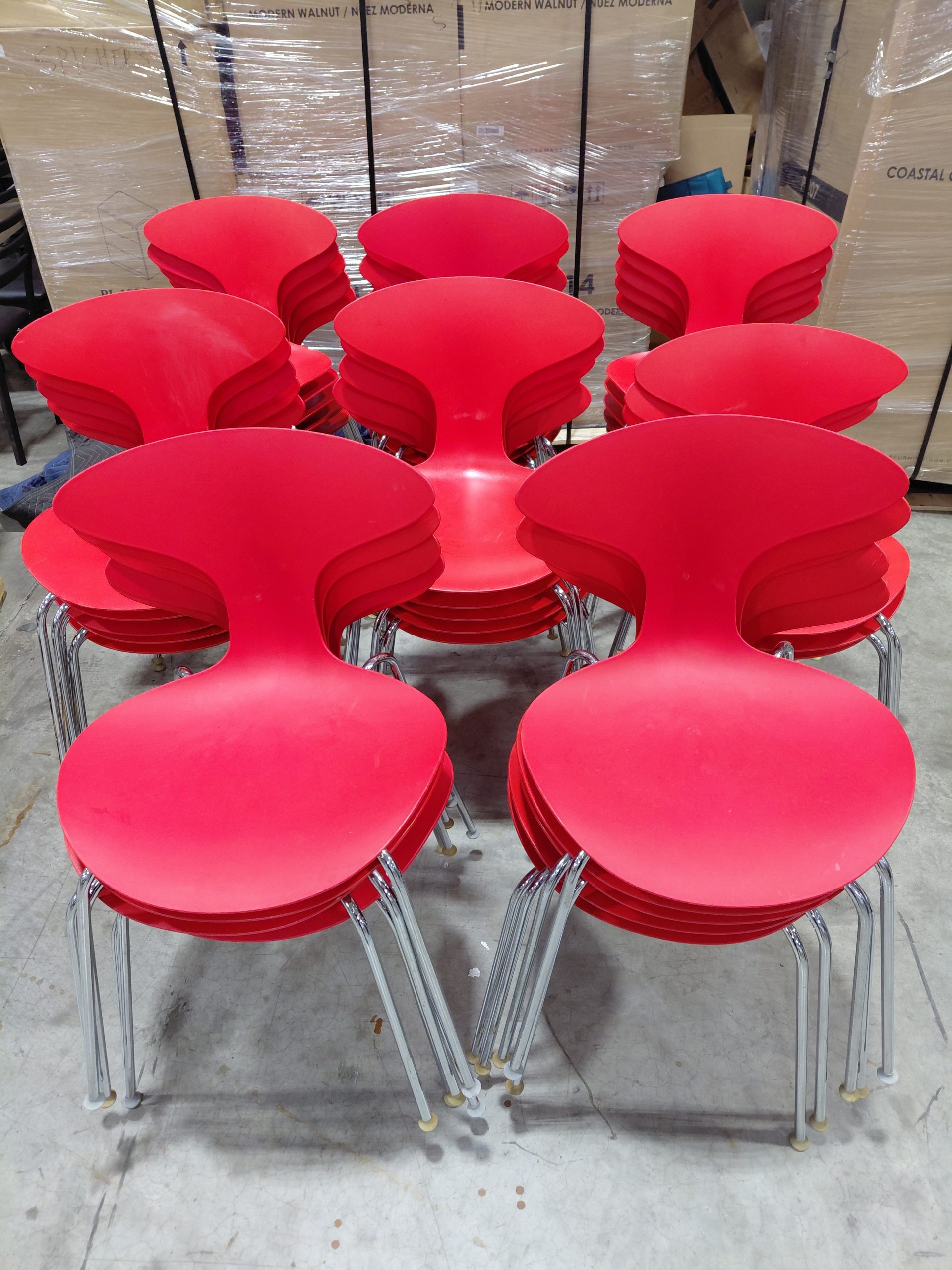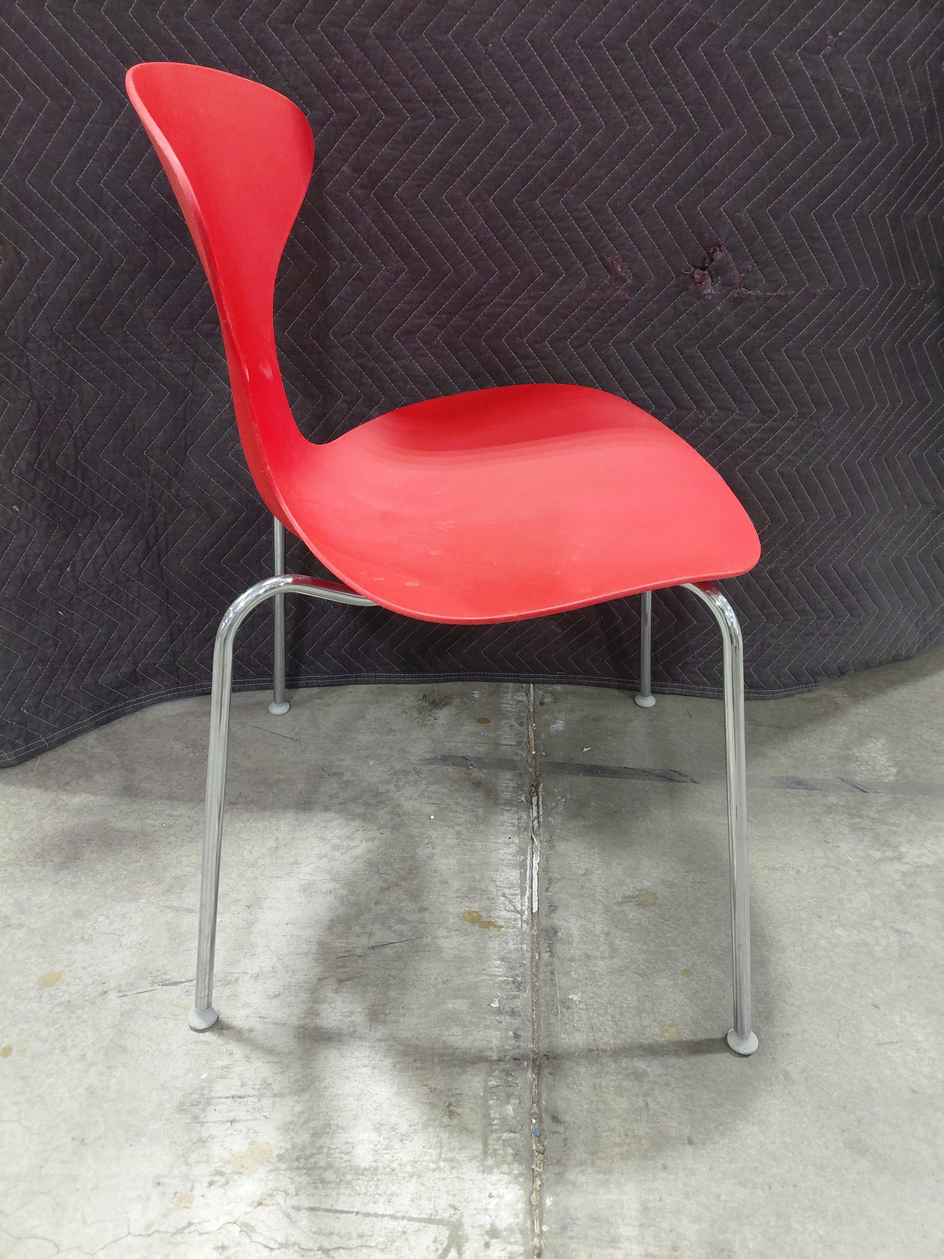 Listed for sale is a set of (the price listed is for one chair, but multiple chairs are available) Orbit chairs in red plastic with chrome legs designed by Ross Lovegrove and produced by Bernhardt design. The chairs were produced circa mid 2010s. This is a classic design by Ross Lovegrove. The condition overall is excellent with some light wear from use.