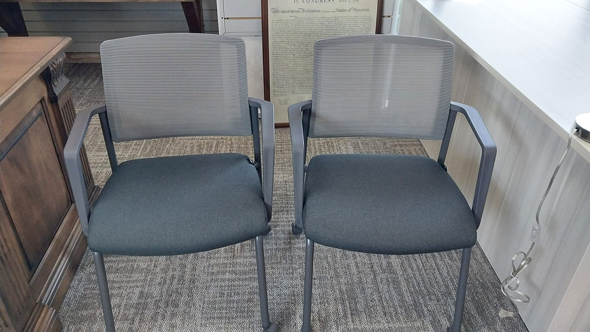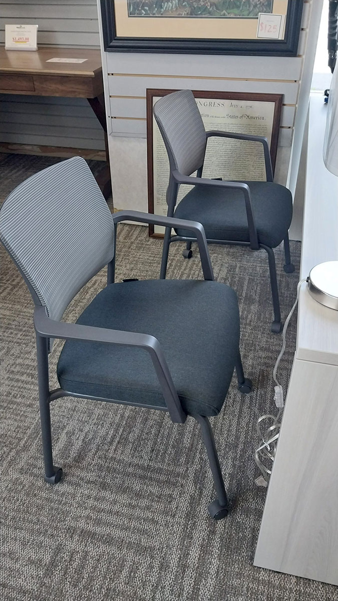 Stocked in gray mesh back with black fabric seat and charcoal frame. Both casters and glides included and features removeable arms.