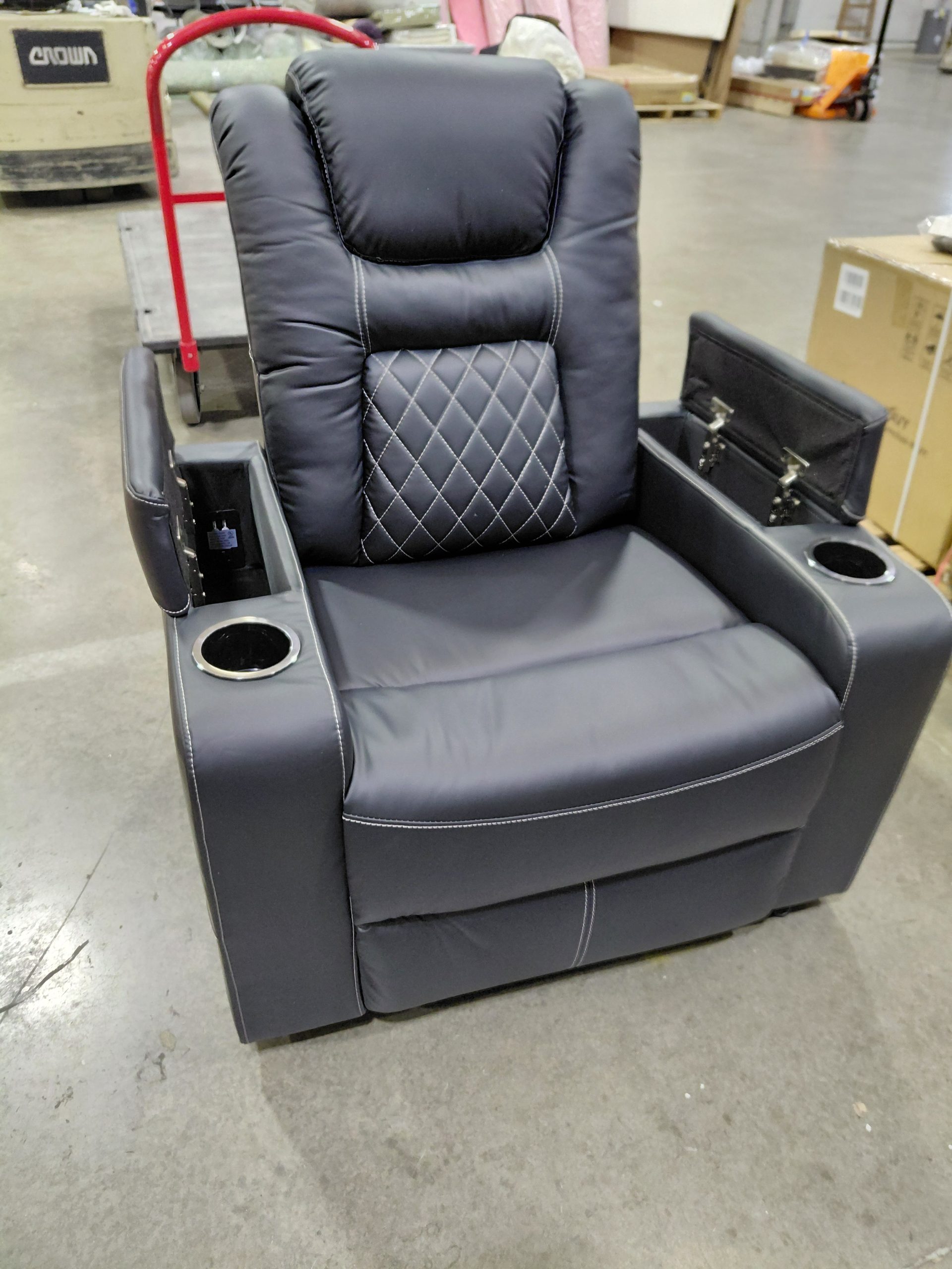 This power-reclining seats offers a streamlined solution for your home theater or living area. The frame is made from a blend of solid and engineered wood, supporting cushioned back and seat filled with a mix of foam and cotton. Wrapped in smooth faux leather, this pieces stand up to daily use with stain- and water-resistant surfaces. Metal pocket springs provide consistent support as you recline at the push of a button. Integrated cup holders keep your favorite drinks within reach during movie marathons. We also love that the hidden arm compartments provide a spot to tuck away remotes.