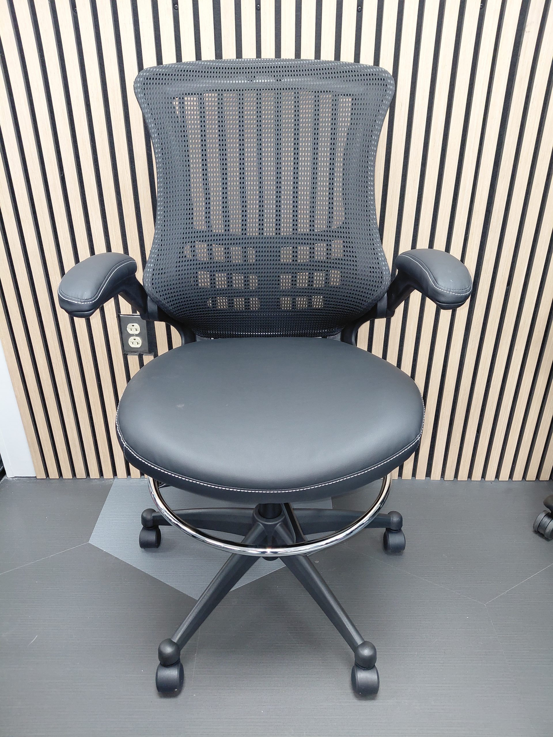 The Serene Collection task stool is designed for tasks and workspaces that require elevated seating while still providing dependable back support. Its flip-up arms help users work closer to surfaces or equipment, while the foot ring offers leg support and helps reduce fatigue during extended use. Finished in black bonded leather with mesh back and a coordinating black base, the stool combines comfort and practicality, making it well-suited for a variety of work environments.