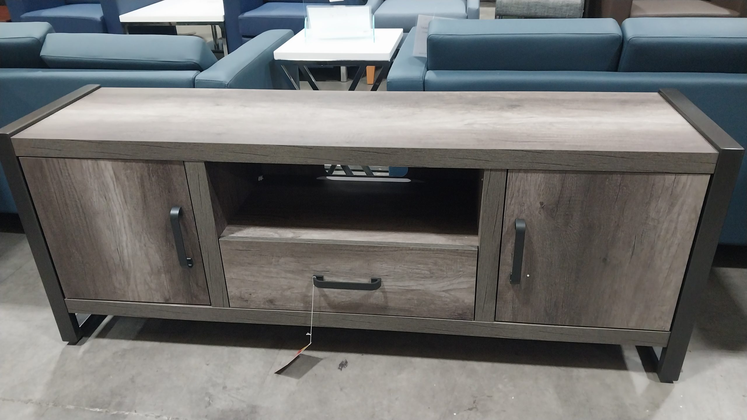Tanners Creek Entertainment 63″ tv stand is sure to bring the whole family together. This entertainment center is scratch resistant, thanks to the use of melamine. The console can accommodate most 70″ TVs and features European hinges for a soft close, an open compartment for components and a center drawers that is flanked by two doors, accented with dark pewter faux metal hardware. Pair with the piers to complete the set.