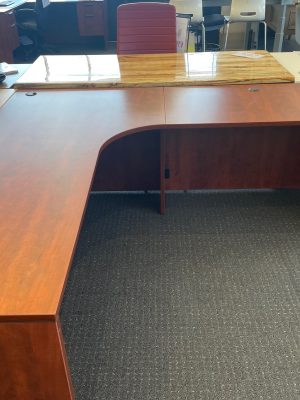Performance Furnishings Double Pedestal Bow Front L Desk w/ Corner Extension, “Mahogany”
